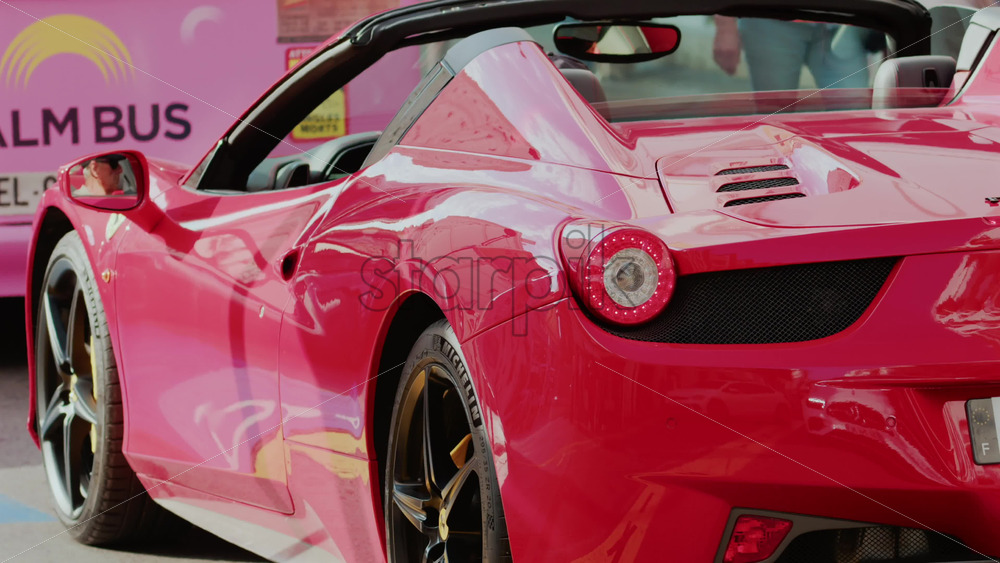 Cannes, France – October 4, 2025: Rear view of a red convertible Ferrari car driving through a city street Royalty Free Stock Video Footage