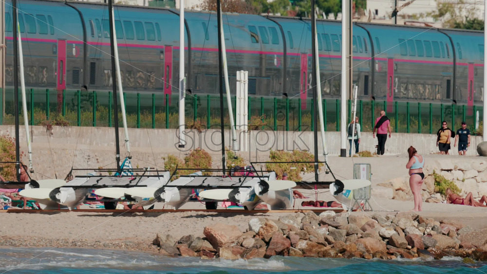 Cannes, France – October 7, 2025: A train passes by a crowded beach as people relax by the sea Royalty Free Stock Video Footage