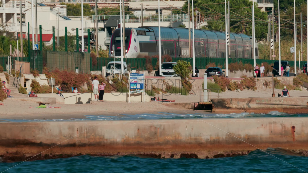 Cannes, France – October 6, 2025: A modern train passes along the coastline near the beach, while people walk and relax nearby Royalty Free Stock Video Footage