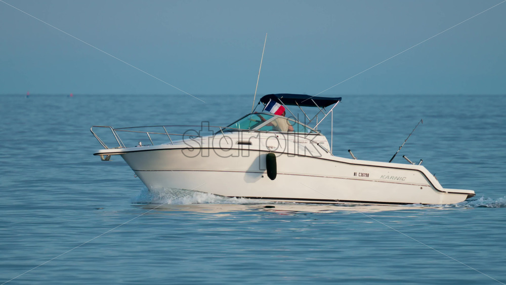 Cannes, France – October 9, 2025: A sleek motor yacht glides across open waters under a clear blue sky Royalty Free Stock Video Footage
