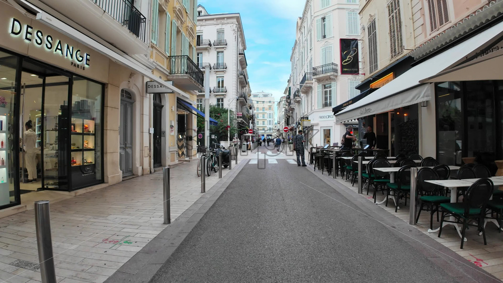 Cannes, France – September 20, 2025: Charming narrow street with outdoor restaurants, boutique shops, and Vespas parked, capturing the Mediterranean vibe Royalty Free Stock Video Footage