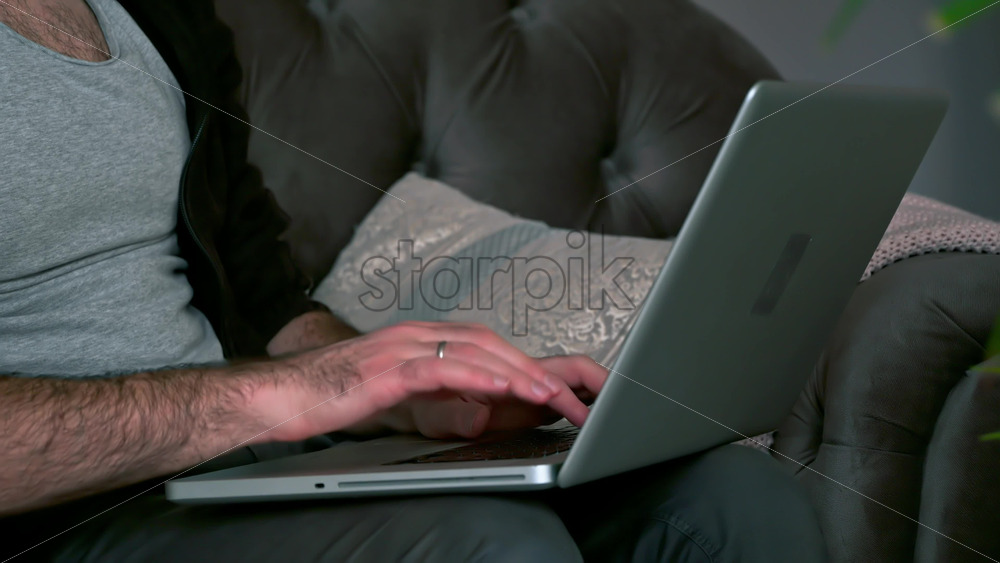 Caucasian woman sitting on a chair, working on her laptop and making notes in notepad. Table with tea and fruits nearby Royalty Free Stock Video Footage