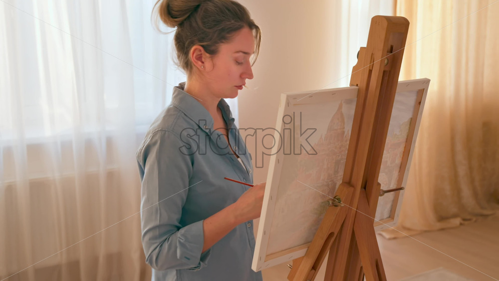 Caucasian woman painting a picture with a palette in her hands, indoors. Slow motion Royalty Free Stock Video Footage