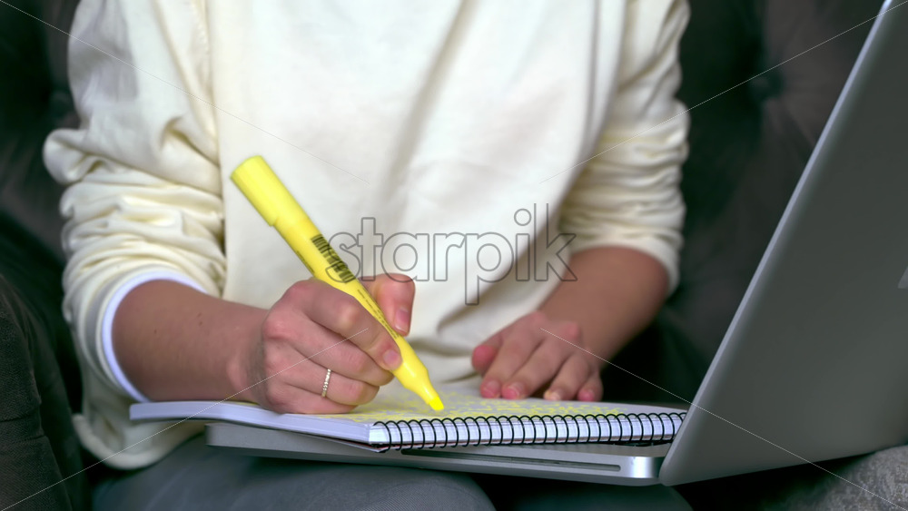 Caucasian woman sitting on a chair, working on her laptop and making notes in notepad. Cat, table with tea and fruits nearby Royalty Free Stock Video Footage