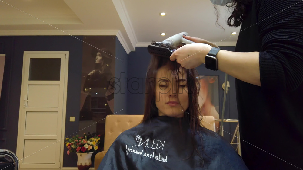 Home » Shop » 1 Video » Video – Chisinau, Moldova – April 15, 2021: Hairdresser wearing mask styling woman’s hair at the salon