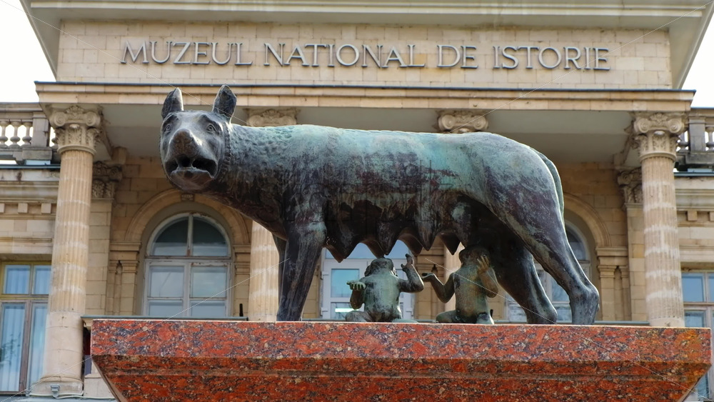 Chisinau, Moldova – September 25, 2025: Historic bronze statue of the Capitoline Wolf with Romulus and Remus on a red marble pedestal in front of the National History Museum of Moldova Royalty Free Stock Video Footage