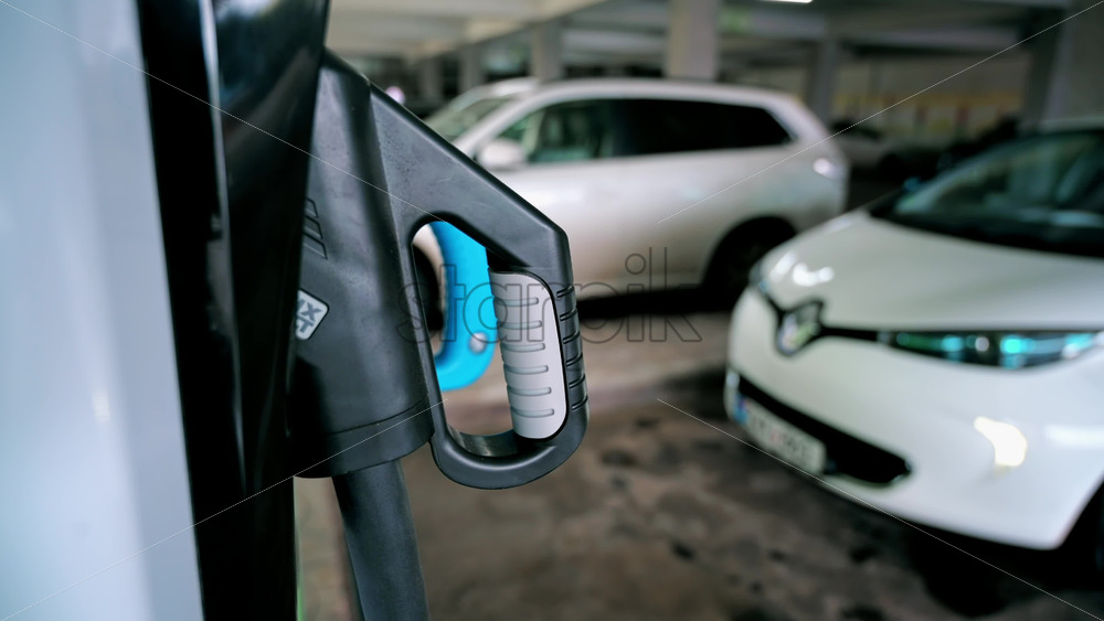 CHISINAU, MOLDOVA – APRIL 26, 2021: Man parking Renault Zoe electric car and starting charging it Royalty Free Stock Video Footage