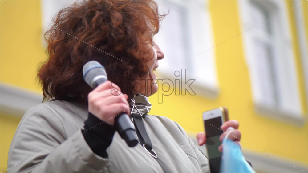 Home » Shop » 1 Video » Video – CHISINAU, MOLDOVA – APRIL 28, 2021: Woman talking in the microphone. People protesting for snap elections in front of constitutional court building. Slow motion