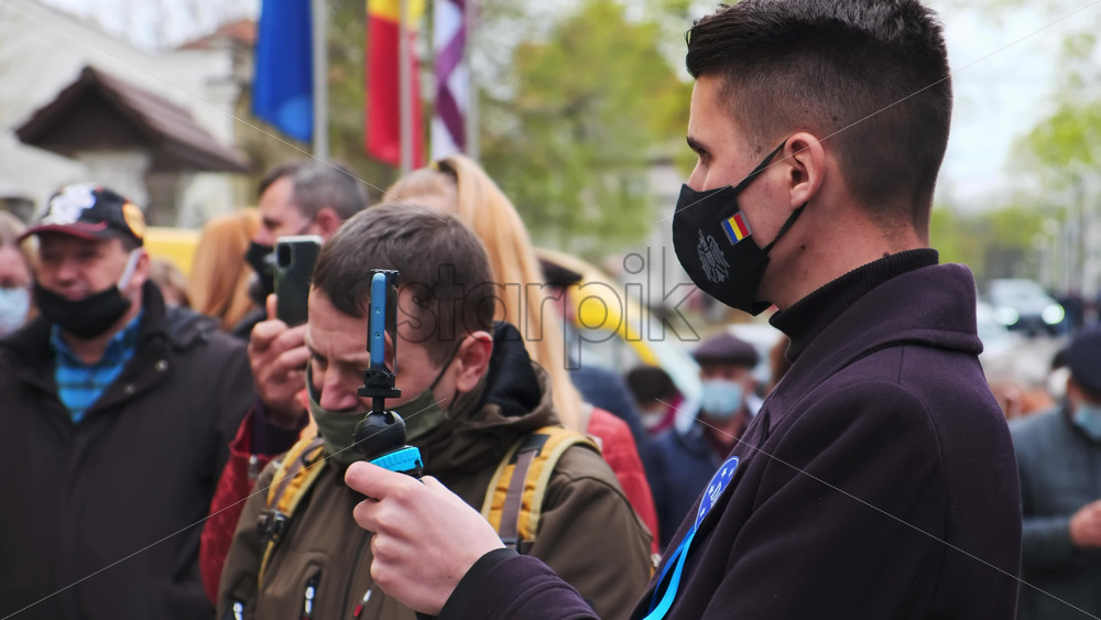 CHISINAU, MOLDOVA – APRIL 28, 2021: Young man shooting a group of talking people on smartphone. People protesting for snap elections in front of constitutional court building Royalty Free Stock Video Footage