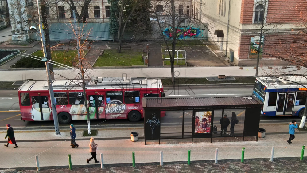 CHISINAU, MOLDOVA – JANUARY 1, 2021: Aerial drone view of a bus stop with moving buses, walking people, bare trees, square on the background Royalty Free Stock Video Footage Royalty Free Stock Video Footage