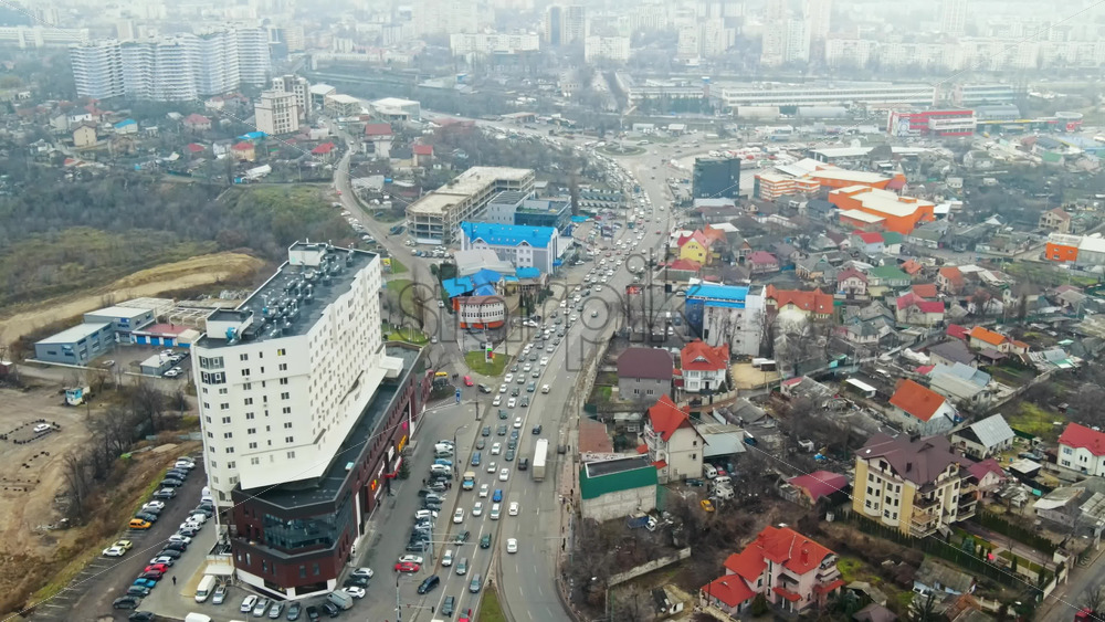 CHISINAU, MOLDOVA – JANUARY 1, 2021: Aerial drone view of a road with multiple moving cars, residential and commercial buildings, bare trees Royalty Free Stock Video Footage Royalty Free Stock Video Footage