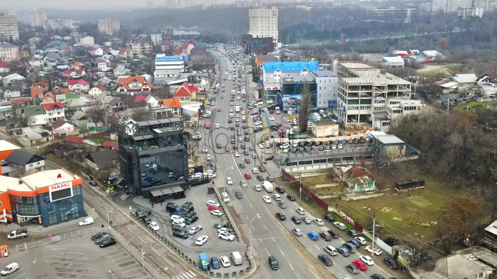 CHISINAU, MOLDOVA – JANUARY 1, 2021: Aerial drone view of a road with multiple moving cars, residential and commercial buildings, bare trees Royalty Free Stock Video Footage Royalty Free Stock Video Footage