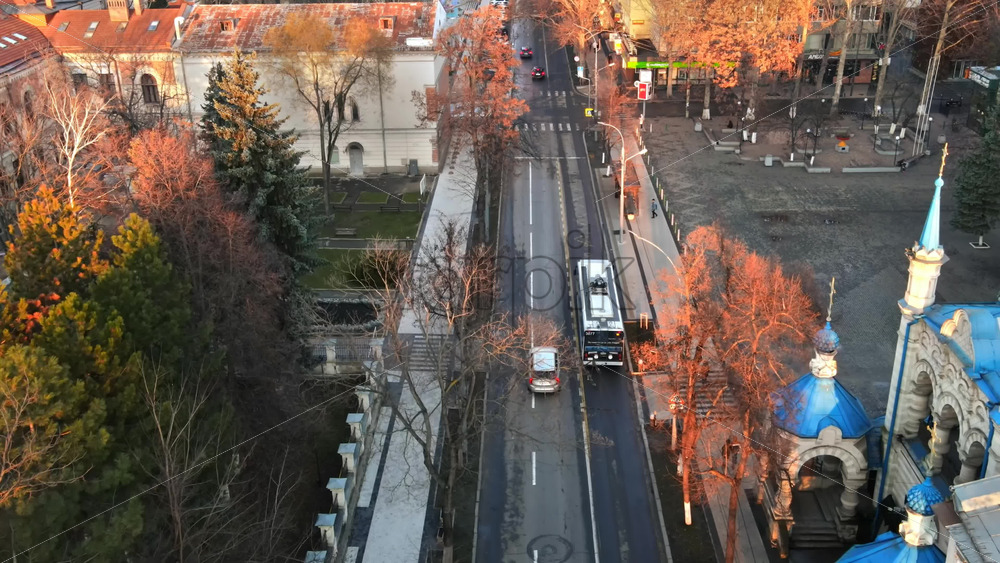 CHISINAU, MOLDOVA – JANUARY 1, 2021: Aerial drone view of a street at sunset. View of buildings, church and squares, moving buses and cars, walking people, bare trees Royalty Free Stock Video Footage Royalty Free Stock Video Footage