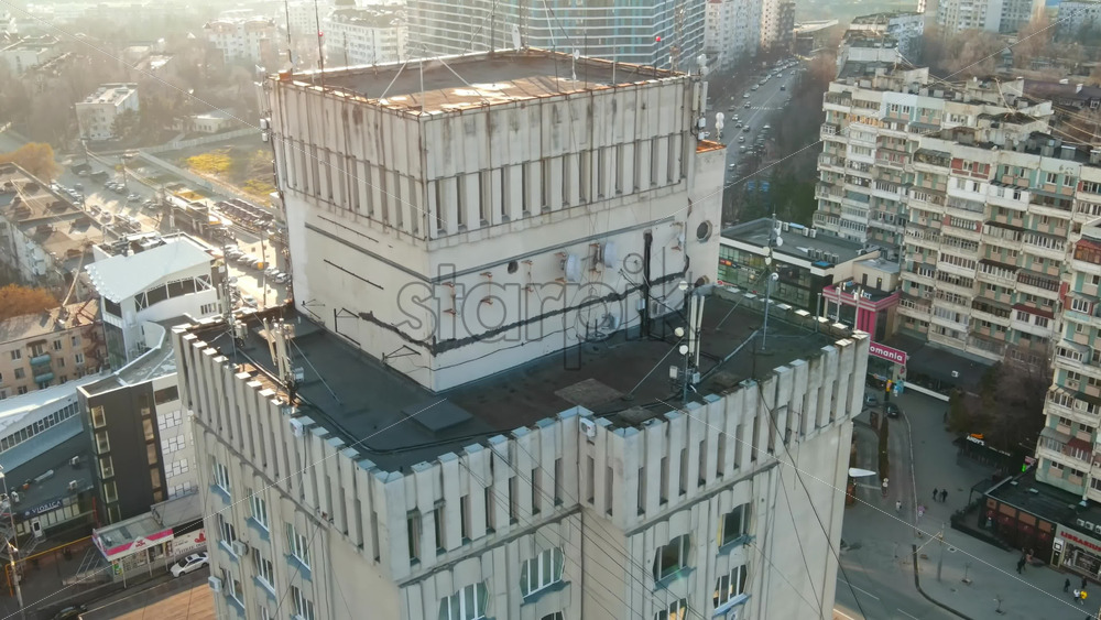 Aerial drone view of Chisinau at sunset. Panorama view of the city center with the Government House and central park, multiple buildings, roads with moving cars, bare trees. Moldova Royalty Free Stock Video Footage Royalty Free Stock Video Footage