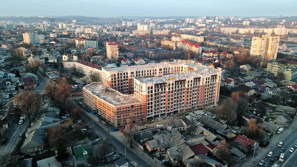 CHISINAU, MOLDOVA – JANUARY 17, 2021: Aerial drone view of city at sunset. Multiple residential and commercial buildings, roads with multiple cars, walking people. Bare trees, winter Royalty Free Stock Video Footage Royalty Free Stock Video Footage