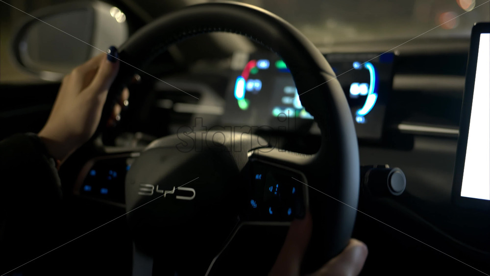 video Chisinau, Moldova – January 30, 2025: Steering wheel of BYD Destroyer 05 driving at night Royalty Free Stock Video Footage