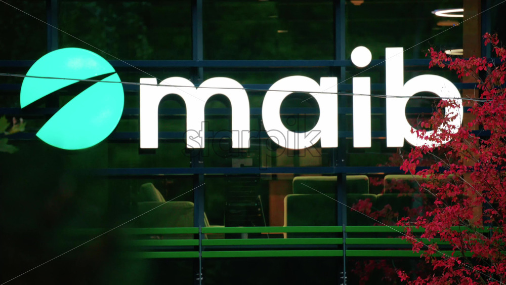 Chisinau, Moldova – October 1, 2025: Modern glass building facade with the illuminated maib logo and red autumn leaves in the foreground Royalty Free Stock Video Footage