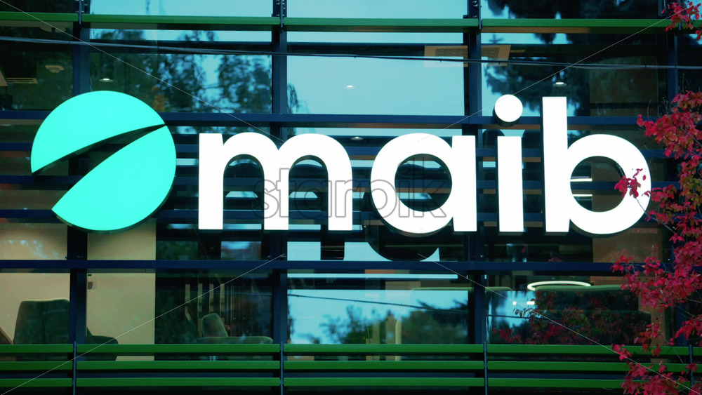 Home » Shop » 1 Video » Video – Chisinau, Moldova – October 1, 2025: Modern glass building facade with the illuminated maib logo and red autumn leaves in the foreground