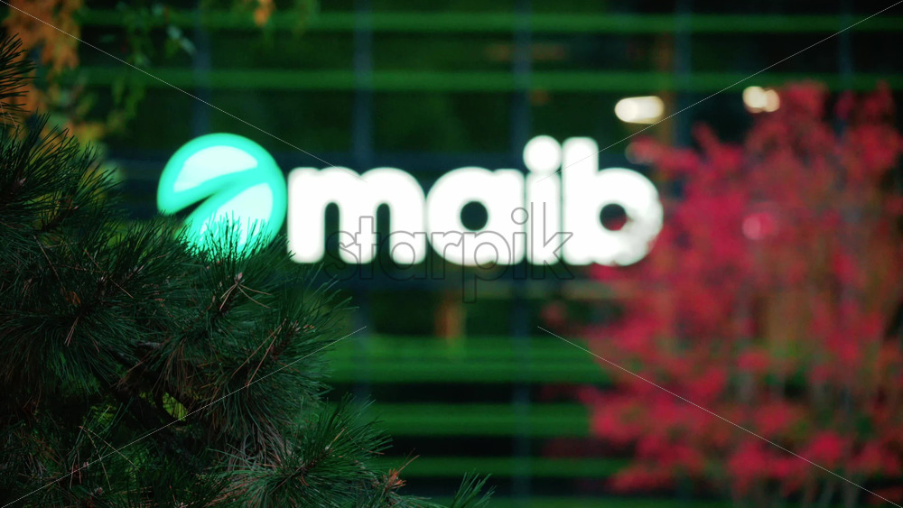 Chisinau, Moldova – October 1, 2025: Modern glass building facade with the illuminated maib logo and red autumn leaves in the foreground Royalty Free Stock Video Footage