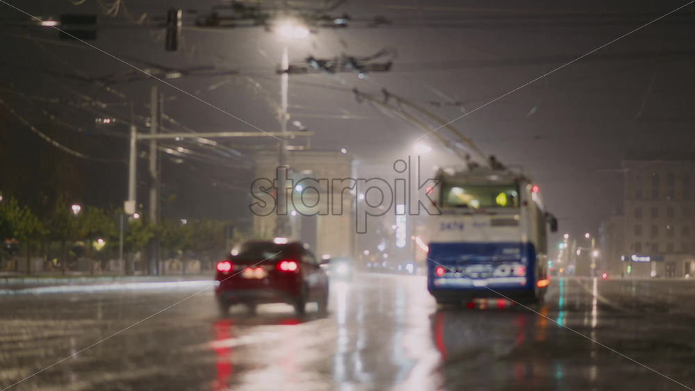 Chisinau, Moldova – October 7, 2025: Rain pours down on city streets as vehicles and trolleybus move cautiously through the waterlogged roads Royalty Free Stock Video Footage