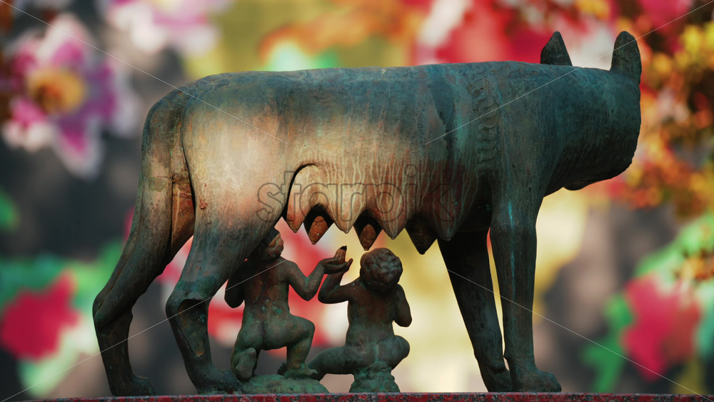 Chisinau, Moldova – September 25, 2025: Historic bronze statue of the Capitoline Wolf with Romulus and Remus on a red marble pedestal in front of the National History Museum of Moldova Royalty Free Stock Video Footage