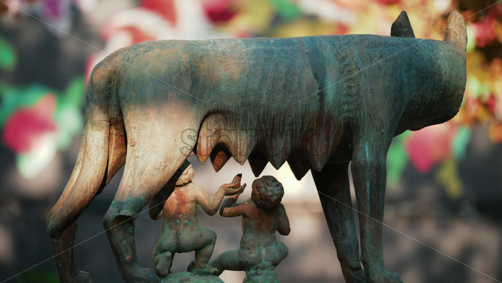Chisinau, Moldova – September 25, 2025: Historic bronze statue of the Capitoline Wolf with Romulus and Remus on a red marble pedestal in front of the National History Museum of Moldova Royalty Free Stock Video Footage