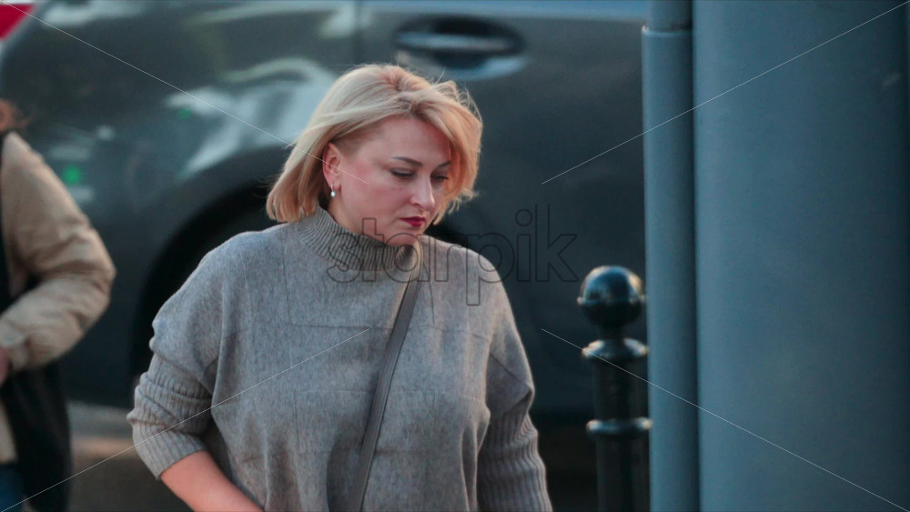 Chisinau, Moldova – September 30, 2025: Blonde woman wearing a grey turtleneck crossing the street in daylight Royalty Free Stock Video Footage