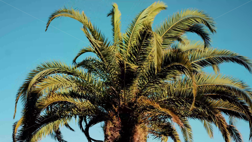 Tropical palm tree with vibrant, oversized leaves swaying in the gentle jungle breeze