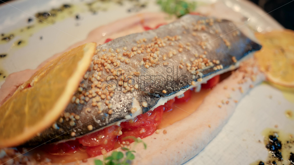 Close up of a beautifully plated fish fillet with sauce, lemon slice, and herbs Royalty Free Stock Video Footage