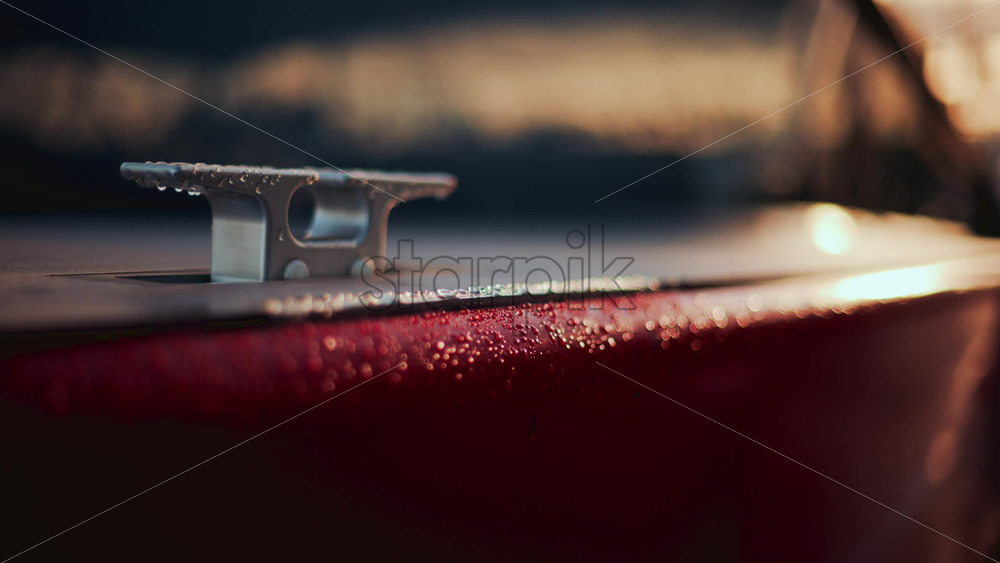 Close up of a boat cleat on a red hull, shining under warm evening sunlight Royalty Free Stock Video Footage