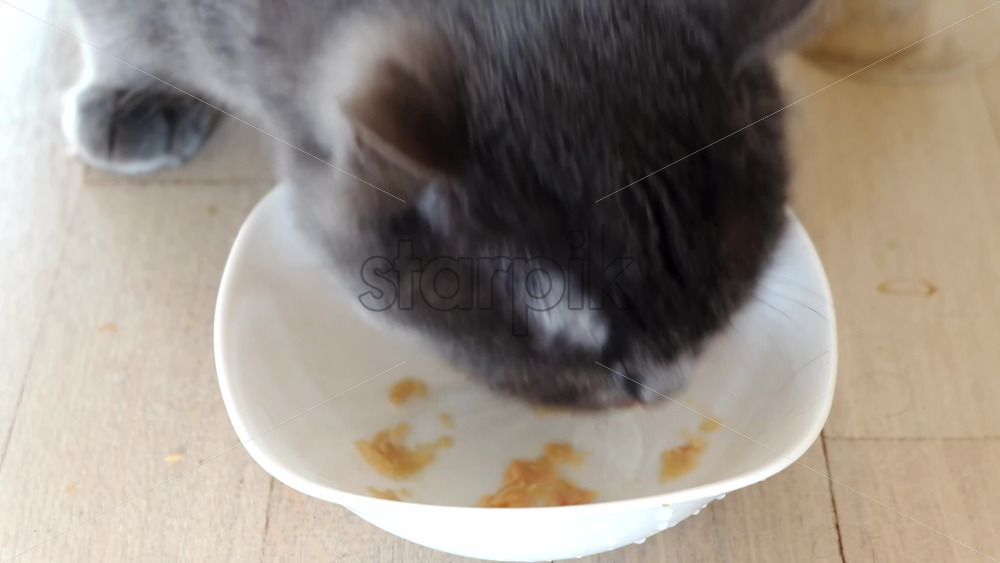 Close up of a British Shorthair cat eating cat food from a white bowl Royalty Free Stock Video Footage