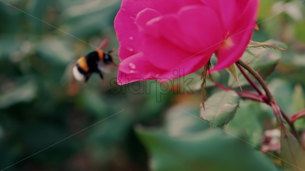 Home » Shop » 1 Video » Video Close up of a bumblebee in a pink rose with water drops in a garden