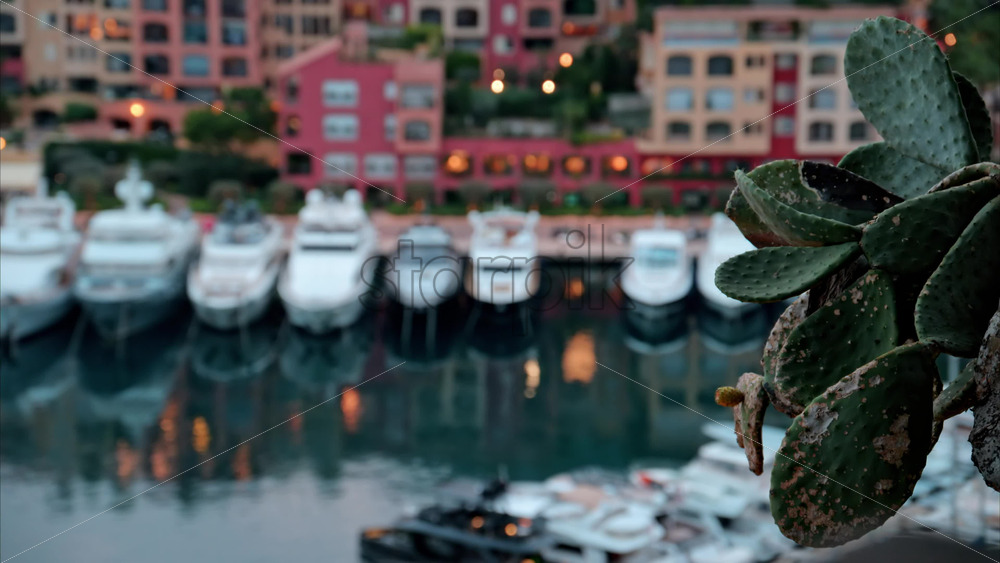 video Close up of a cactus with a view of boats docked in the Port de Fontvieille with the skyline of Monaco on the background in the evening Royalty Free Stock Video Footage