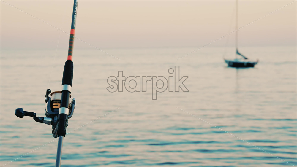 Close up of a fishing rod and reel positioned near the sea, with a blurred boat in the background Royalty Free Stock Video Footage