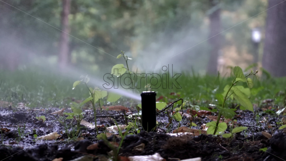 Close up of a water sprinkler in action, spraying water across grass and plants Royalty Free Stock Video Footage
