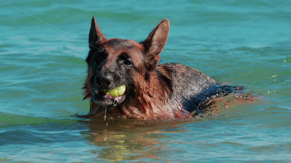 Close up of a German Shepherd emerging from the turquoise sea with a ball in its mouth in Cannes, France Royalty Free Stock Video Footage
