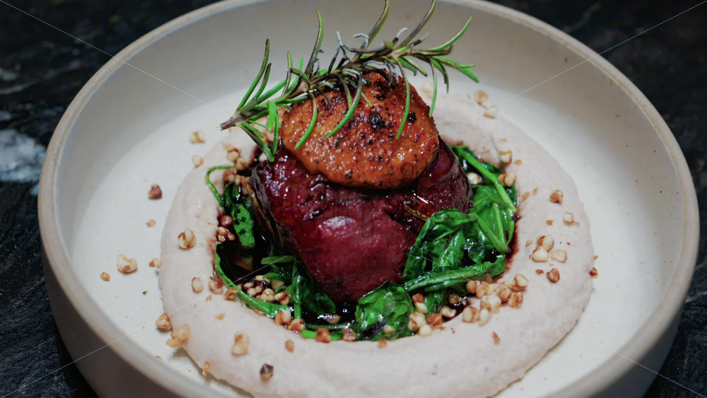 Close up of a beautifully plated beef filet, topped with a golden crust and garnished with rosemary Royalty Free Stock Video Footage