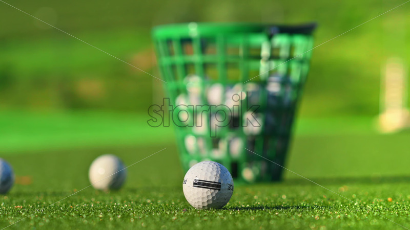VIDEO Multiple golf balls near a green bucket on a course, on a sunny day Royalty Free Stock Video Footage