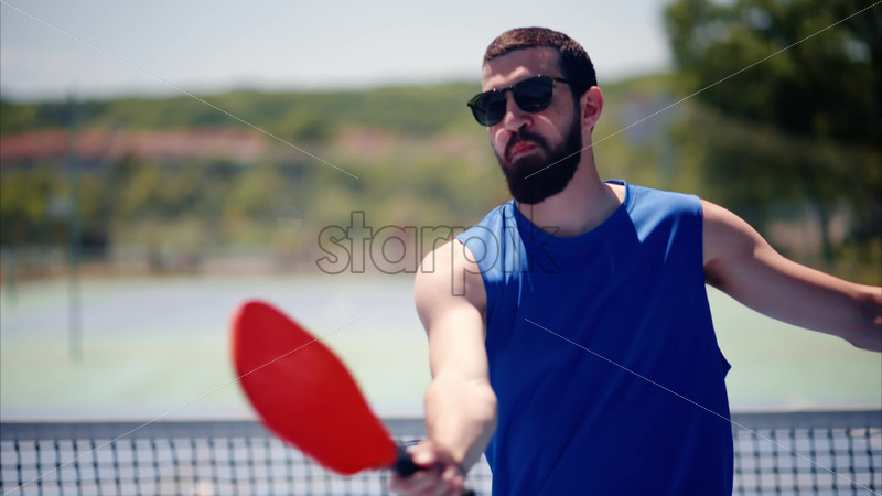 VIDEO Close up of a man in a blue shirt playing pickleball with a red racket on a sunny day Royalty Free Stock Video Footage