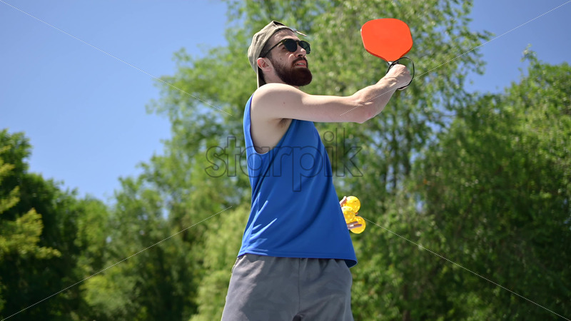 VIDEO Close up of a man in a blue shirt playing pickleball with a red racket on a sunny day Royalty Free Stock Video Footage