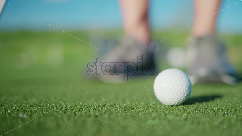 VIDEO Close up of a man practicing hitting a golf ball with a club on the course Royalty Free Stock Video Footage