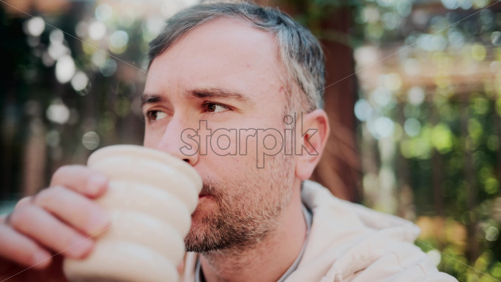 Close up of a man sipping coffee in natural sunlight at a cozy outdoor cafe Royalty Free Stock Video Footage