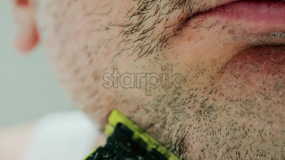 Home » Shop » 1 Video » Video – Close up of a man using an electric razor to trim facial hair in the bathroom