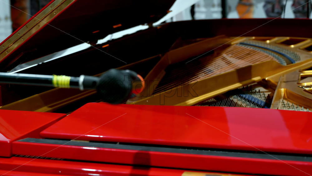 Close-up of a microphone and a red piano on the backstage of a TV set Royalty Free Stock Video Footage Royalty Free Stock Video Footage