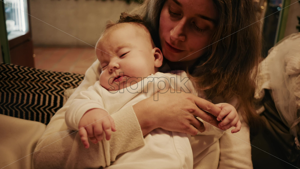 Close-up of a mother gently holding a sleeping baby in a warm indoor setting Royalty Free Stock Video Footage