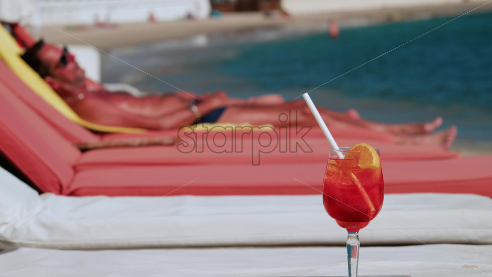 Refreshing red orange cocktail with ice and orange slice against the deep blue Mediterranean Sea Royalty Free Stock Video Footage