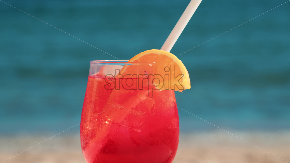 Refreshing red orange cocktail with ice and orange slice against the deep blue Mediterranean Sea Royalty Free Stock Video Footage