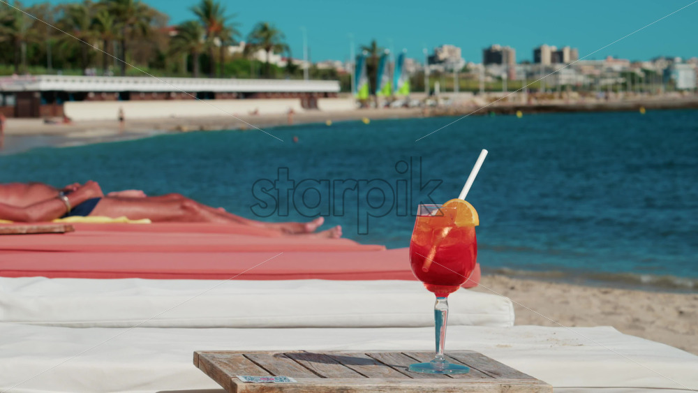 Refreshing red orange cocktail with ice and orange slice against the deep blue Mediterranean Sea Royalty Free Stock Video Footage