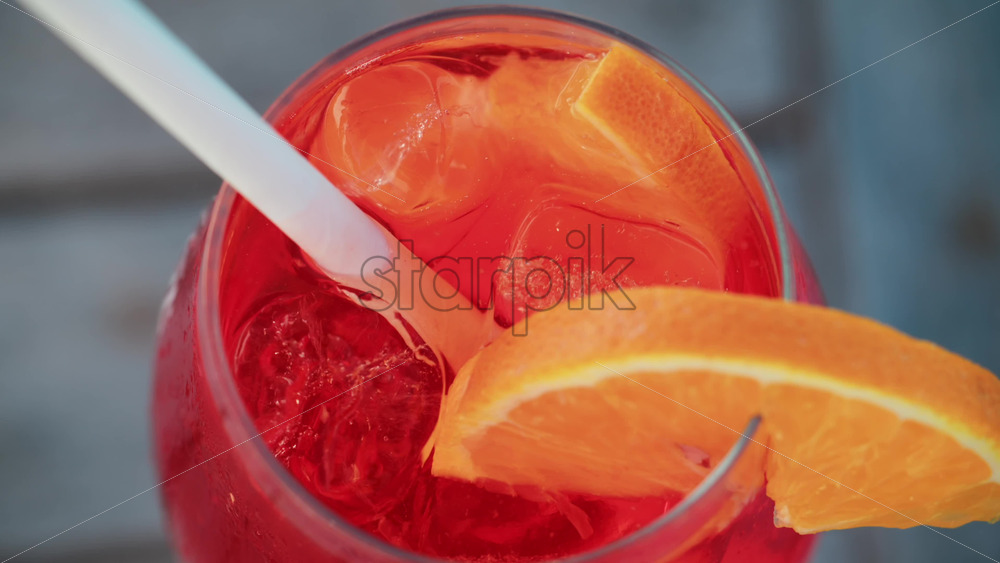 Close up of a refreshing red orange cocktail with orange slice and ice cubes, captured outdoors on a sunny day in Cannes. Vertical Royalty Free Stock Video Footage