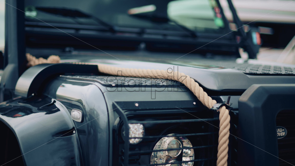 Close up of a rugged off road vehicle with a thick rope across its hood Royalty Free Stock Video Footage